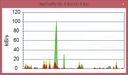 Once you lot've downloaded NetTraffic, yous tin can simply run it without any installations. It volition start from the organization tray, and when you hit the NetTraffic icon from the system tray it will show a small window displaying the real-time traffic graphs.